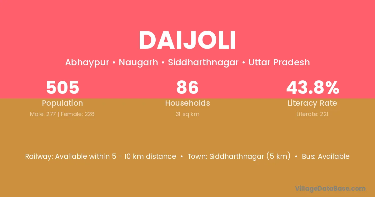 Siddharthnagar (5 km) is the nearest town to Daijoli village for major economic activities and is located approximately 5 km away.