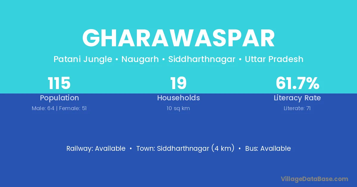 Siddharthnagar (4 km) is the nearest town to Gharawaspar village for major economic activities and is located approximately 4 km away.