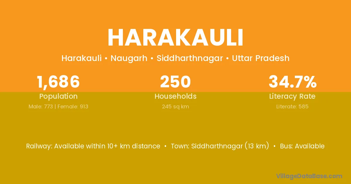 Siddharthnagar (13 km) is the nearest town to Harakauli village for major economic activities and is located approximately 13 km away.
