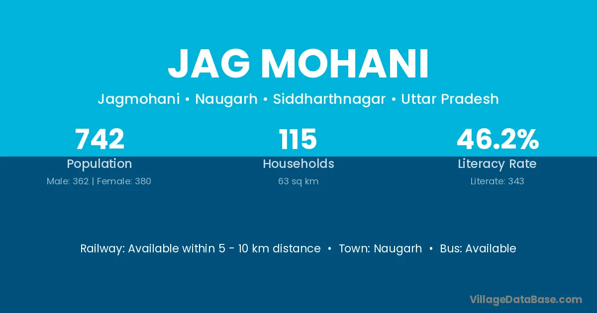 Jag Mohani village has a total population of 742 people, of which 362 are males and 380 are females.