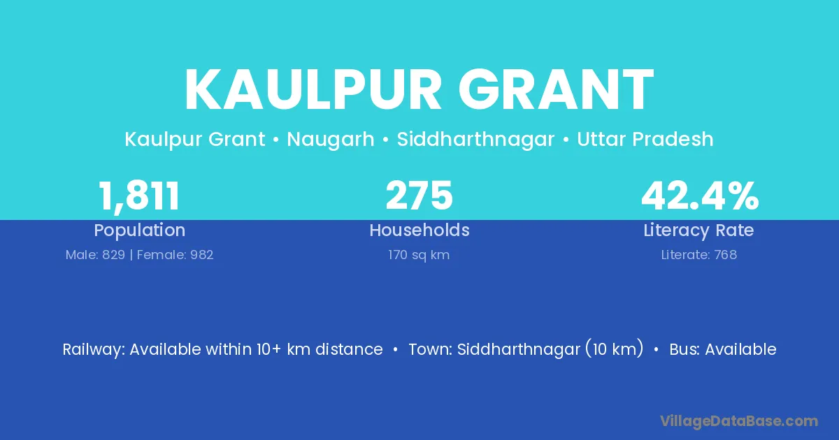 Siddharthnagar (10 km) is the nearest town to Kaulpur Grant village for major economic activities and is located approximately 10 km away.