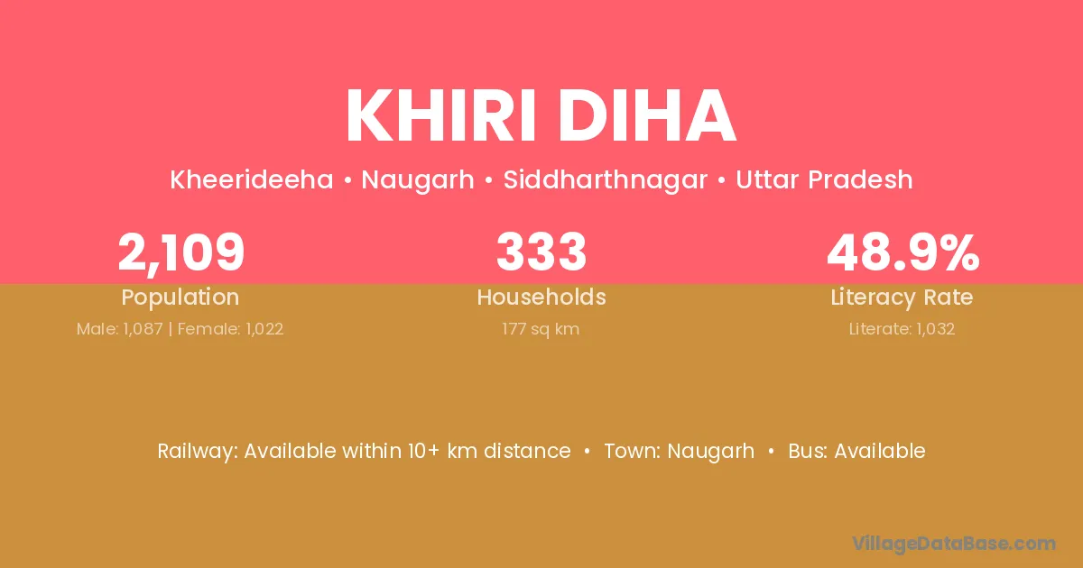 Khiri Diha village has a total population of 2,109 people, of which 1,087 are males and 1,022 are females.