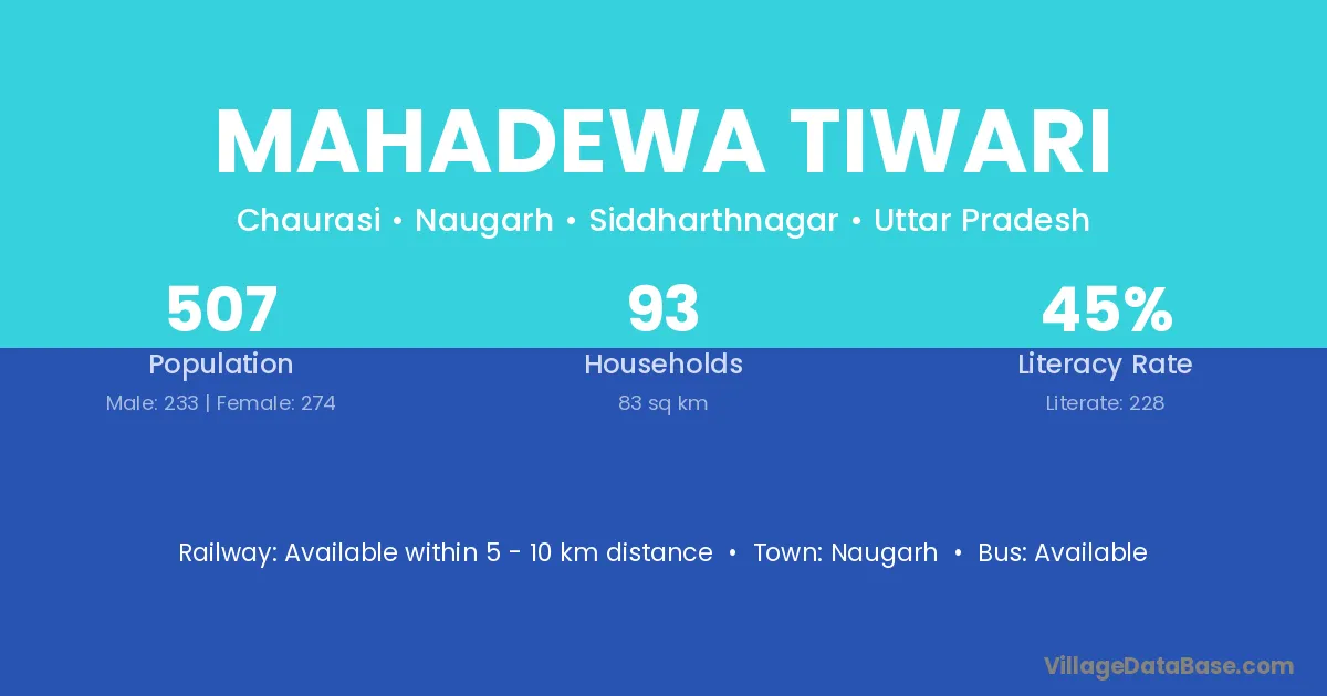 Mahadewa Tiwari village has a total population of 507 people, of which 233 are males and 274 are females.