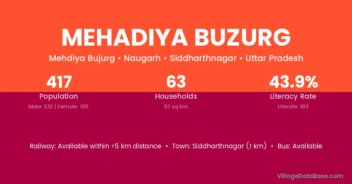 Siddharthnagar (1 km) is the nearest town to Mehadiya Buzurg village for major economic activities and is located approximately 1 km away.