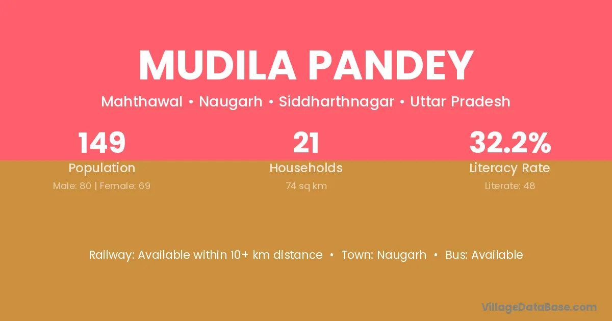 Mudila Pandey village has a total population of 149 people, of which 80 are males and 69 are females.