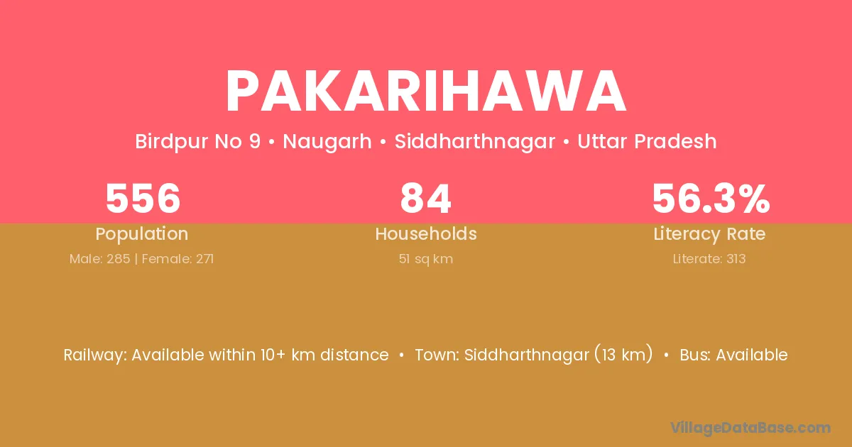 Siddharthnagar (13 km) is the nearest town to Pakarihawa village for major economic activities and is located approximately 13 km away.