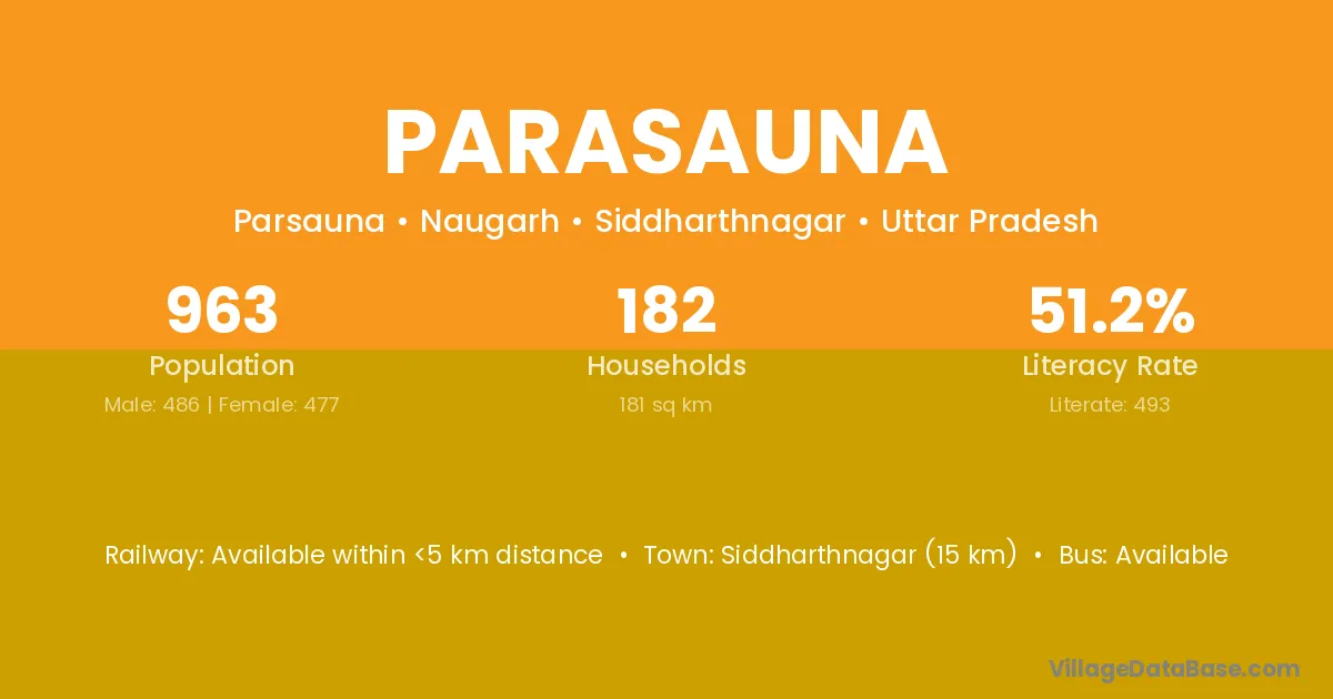 Siddharthnagar (15 km) is the nearest town to Parasauna village for major economic activities and is located approximately 15 km away.