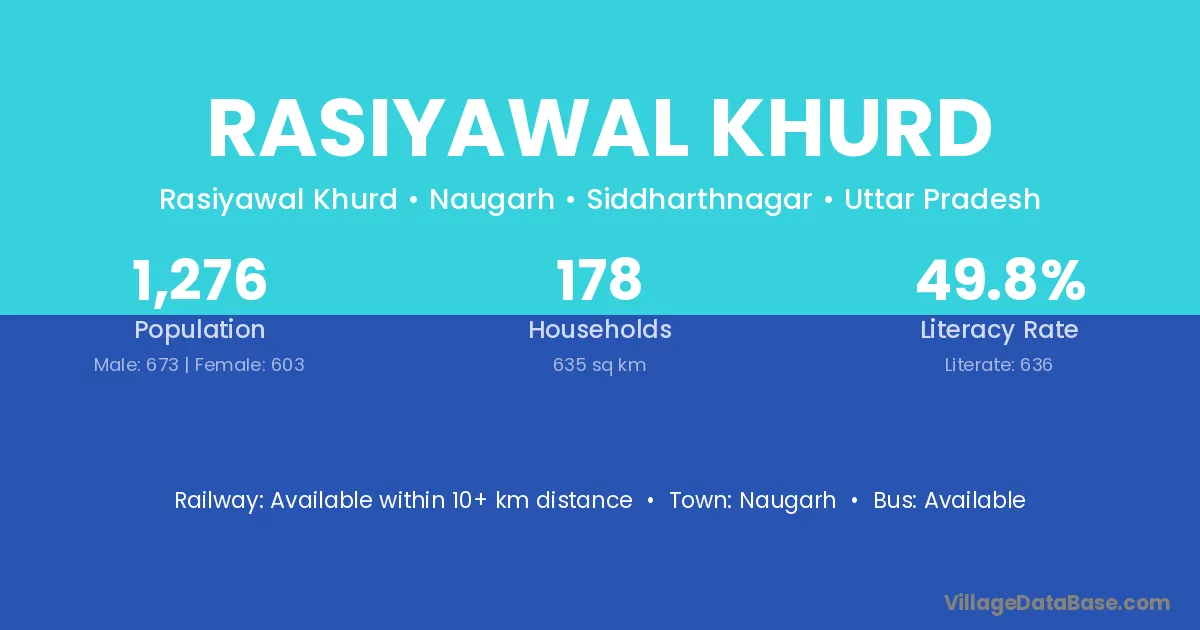 Rasiyawal Khurd village has a total population of 1,276 people, of which 673 are males and 603 are females.