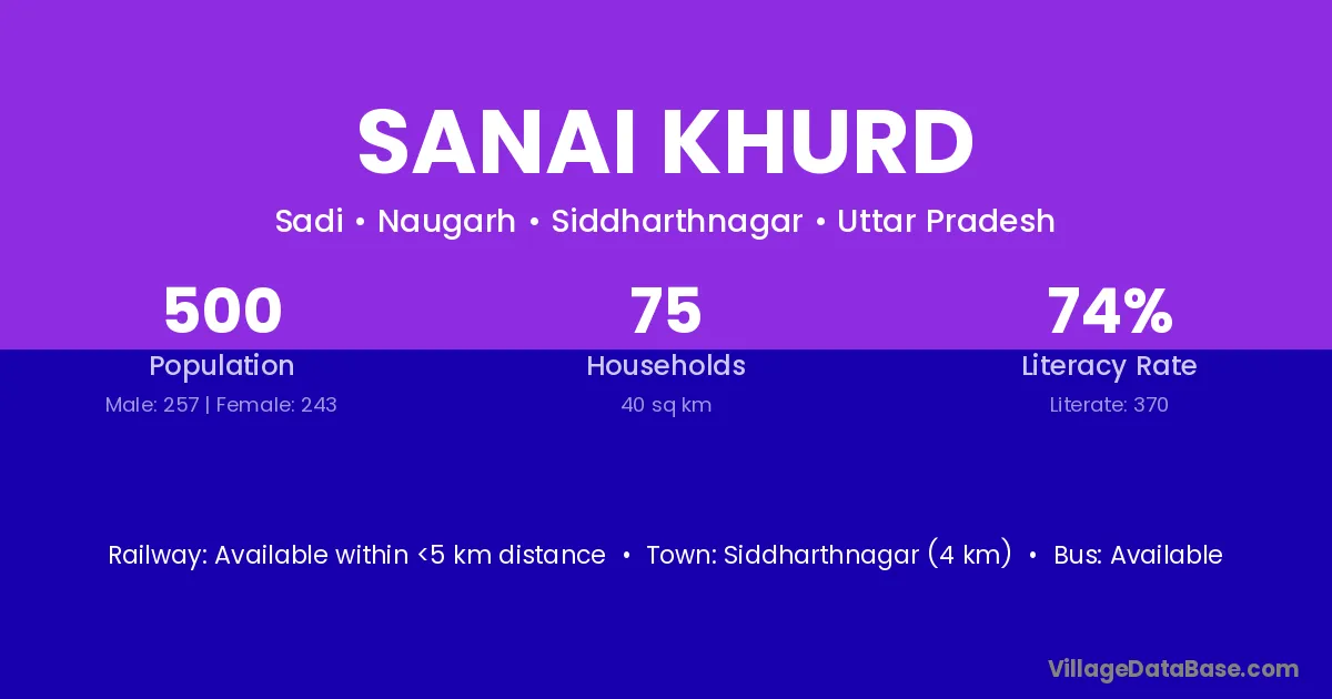 Siddharthnagar (4 km) is the nearest town to Sanai Khurd village for major economic activities and is located approximately 4 km away.