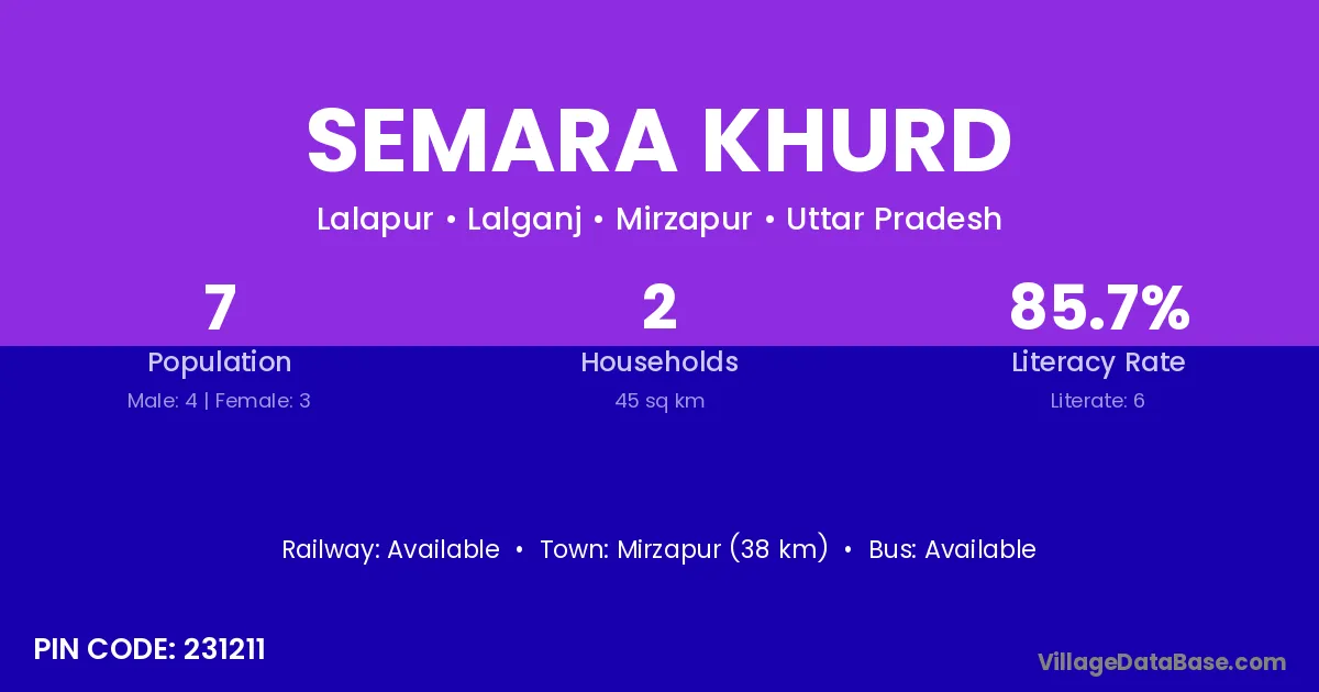 The literacy rate of Semara Khurd village is 40.21%. Male literacy stands at 45.00% and female literacy at 34.35%.