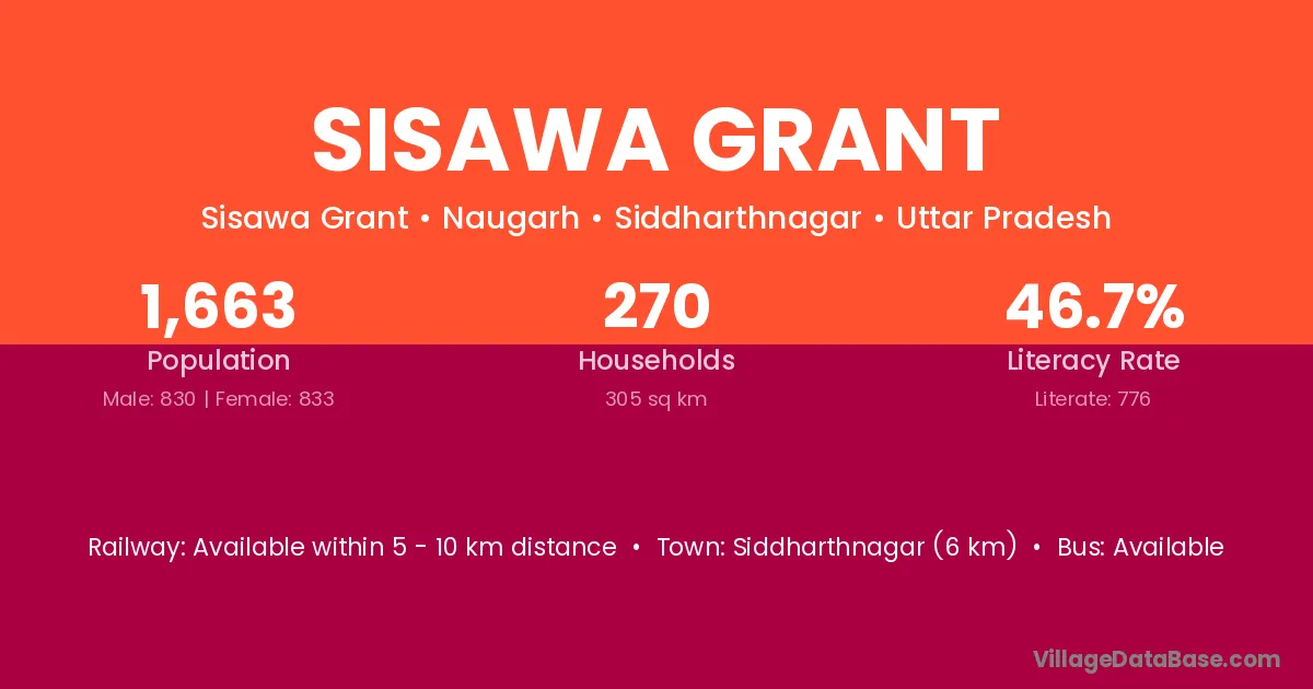 Siddharthnagar (6 km) is the nearest town to Sisawa Grant village for major economic activities and is located approximately 6 km away.
