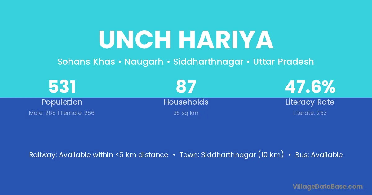 Siddharthnagar (10 km) is the nearest town to Unch Hariya village for major economic activities and is located approximately 10 km away.