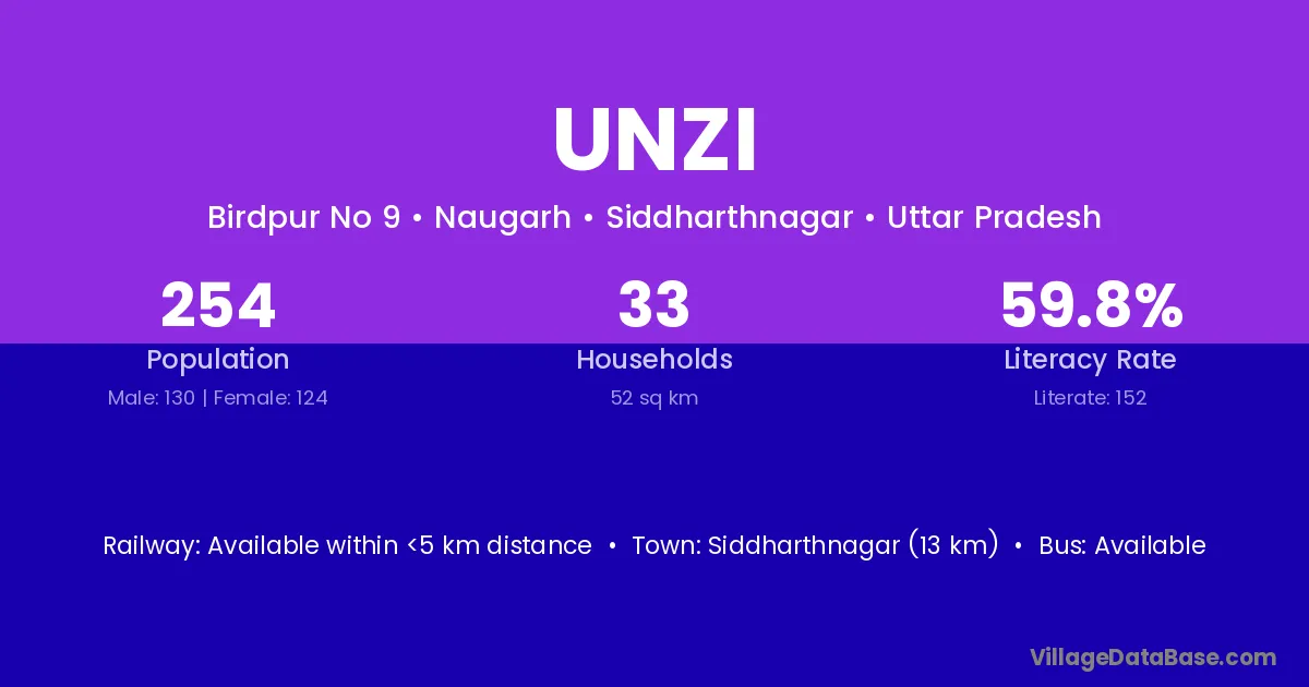 Siddharthnagar (13 km) is the nearest town to Unzi village for major economic activities and is located approximately 13 km away.