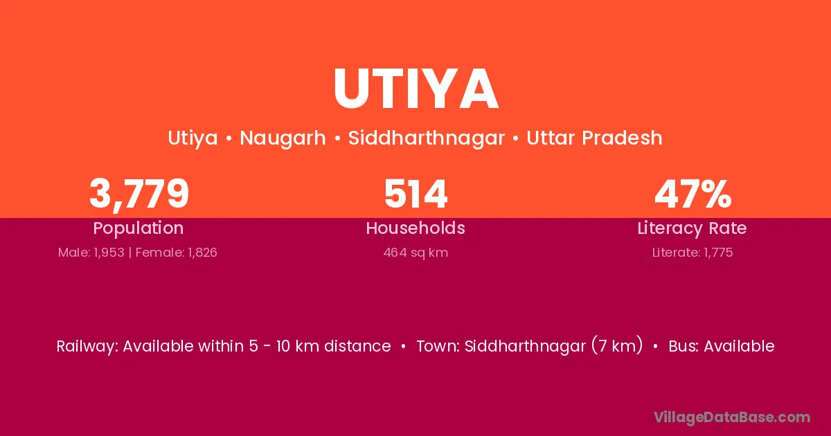 Siddharthnagar (7 km) is the nearest town to Utiya village for major economic activities and is located approximately 7 km away.