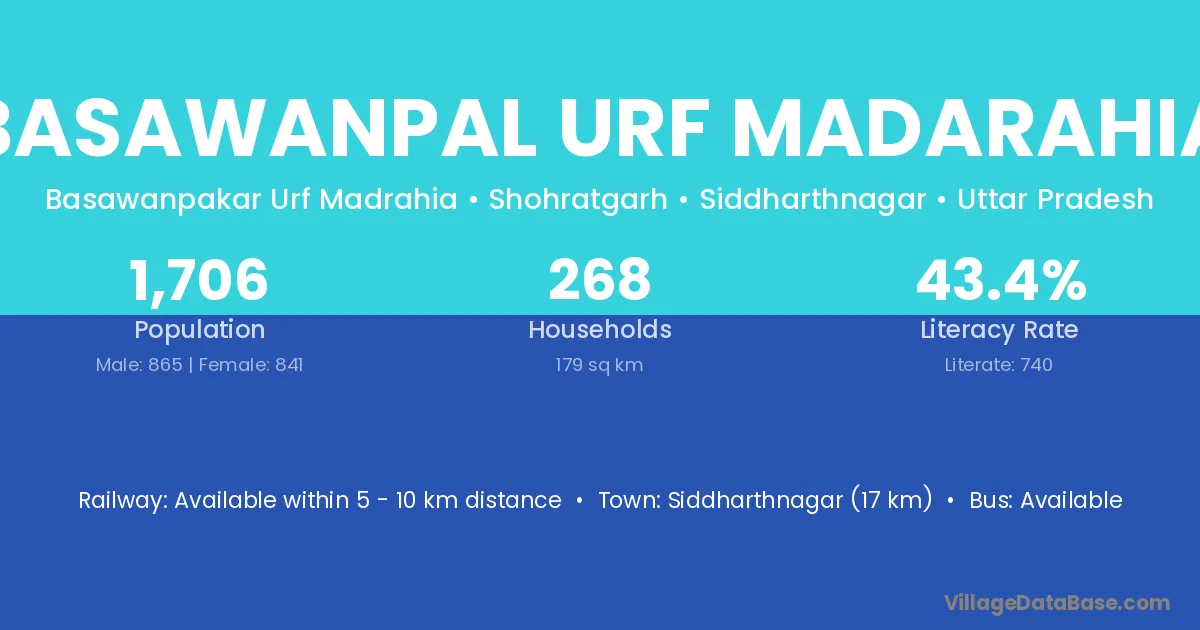 Siddharthnagar (17 km) is the nearest town to Basawanpal Urf Madarahia village for major economic activities and is located approximately 17 km away.