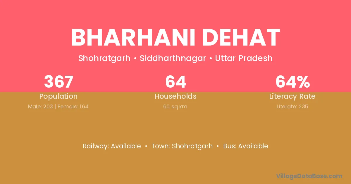 Bharhani Dehat village has a total population of 367 people, of which 203 are males and 164 are females.