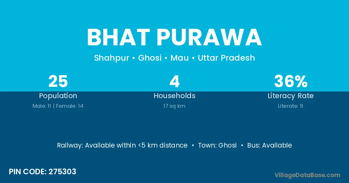 The literacy rate of Bhat Purawa village is 32.11%. Male literacy stands at 42.58% and female literacy at 24.00%.