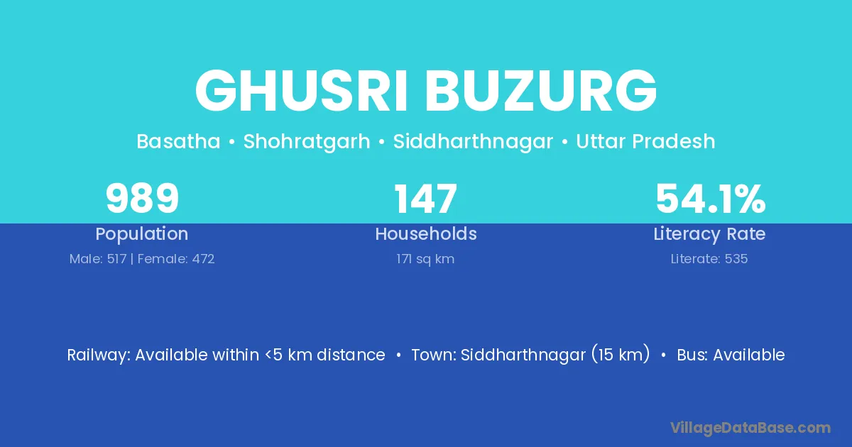 Siddharthnagar (15 km) is the nearest town to Ghusri Buzurg village for major economic activities and is located approximately 15 km away.