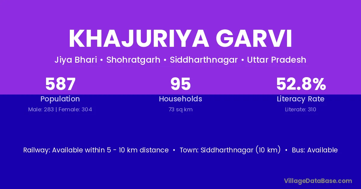 Siddharthnagar (10 km) is the nearest town to Khajuriya Garvi village for major economic activities and is located approximately 10 km away.