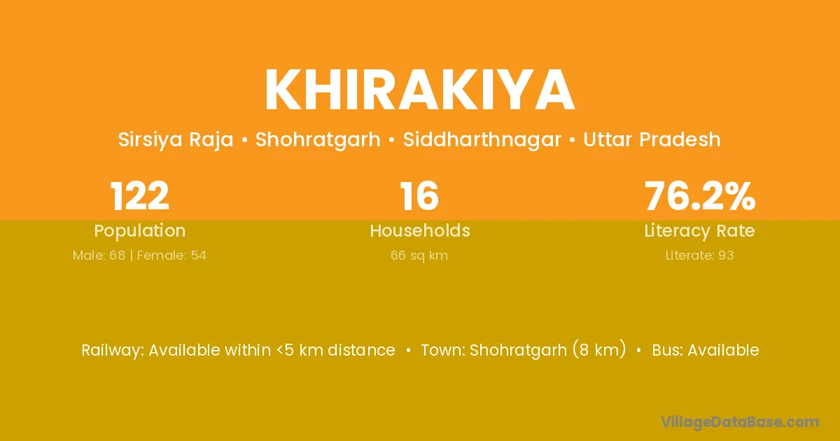 Shohratgarh (8 km) is the nearest town to Khirakiya village for major economic activities and is located approximately 8 km away.