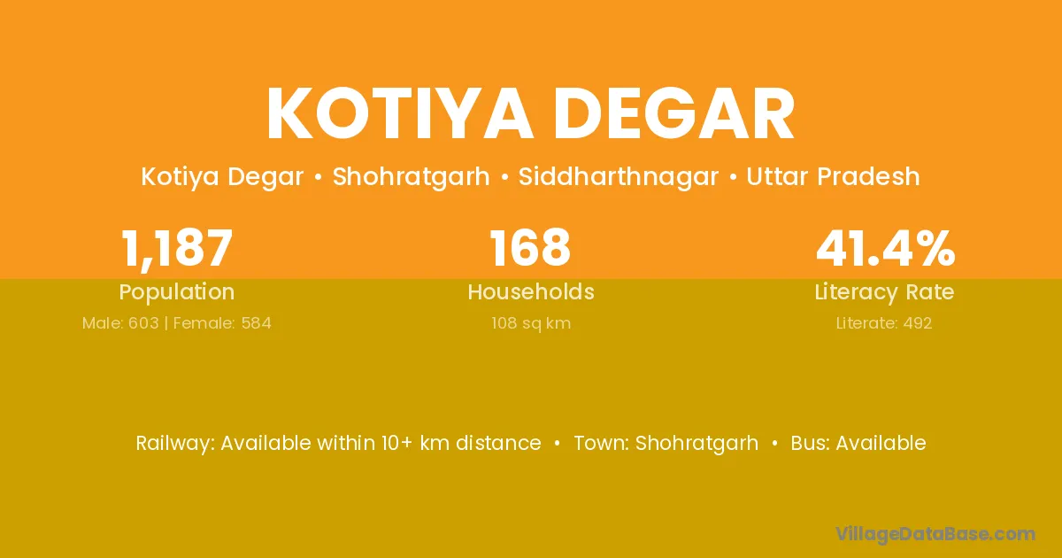 Kotiya Degar village has a total population of 1,187 people, of which 603 are males and 584 are females.