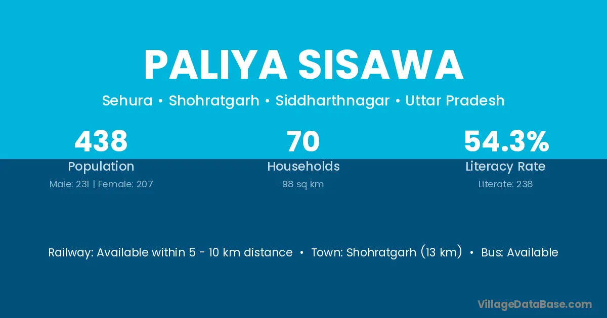 Paliya Sisawa village has a total population of 438 people, of which 231 are males and 207 are females.