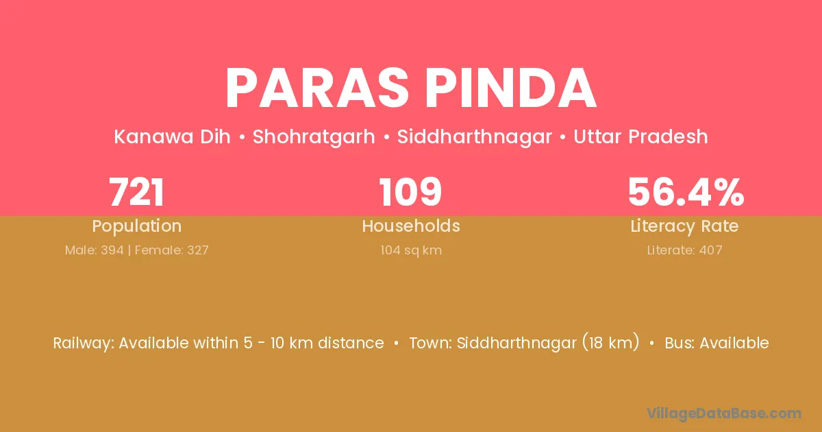 Siddharthnagar (18 km) is the nearest town to Paras Pinda village for major economic activities and is located approximately 18 km away.