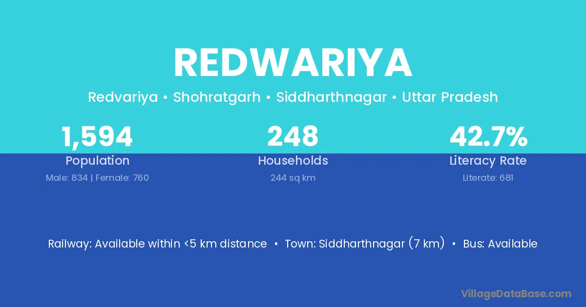 Siddharthnagar (7 km) is the nearest town to Redwariya village for major economic activities and is located approximately 7 km away.