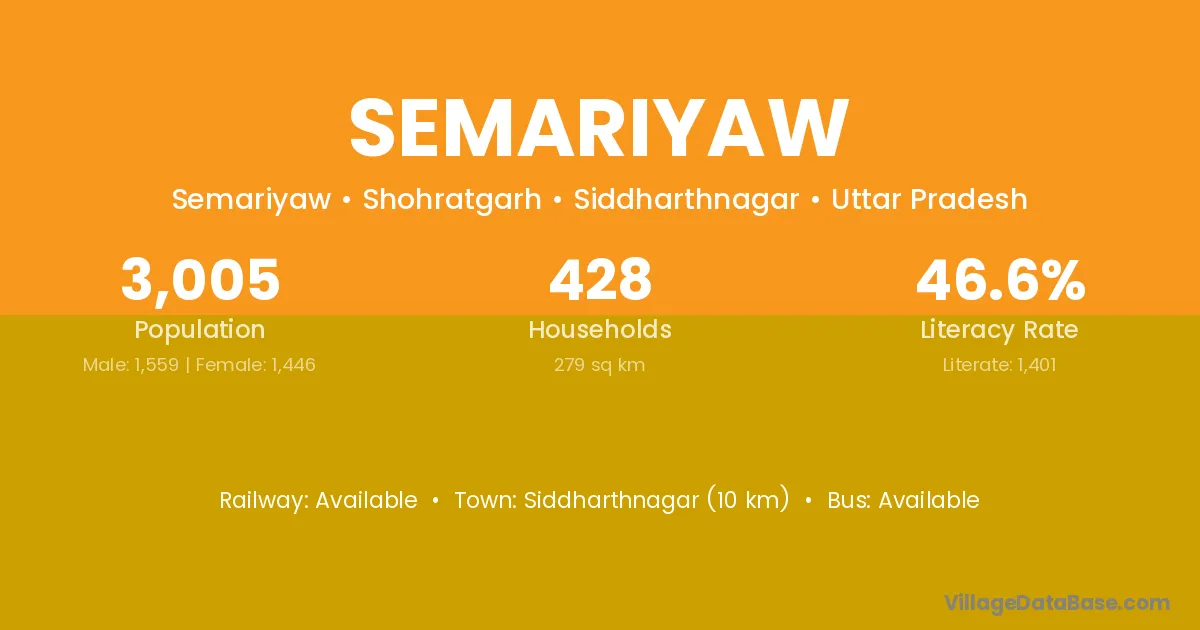 Siddharthnagar (10 km) is the nearest town to Semariyaw village for major economic activities and is located approximately 10 km away.