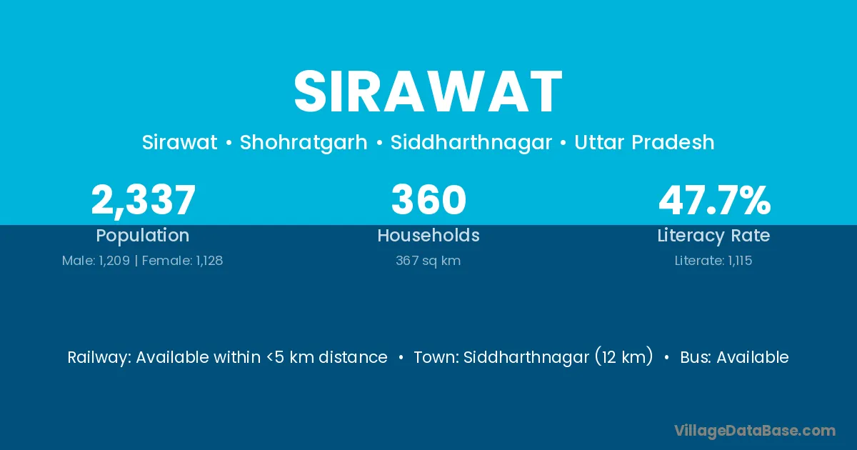 Siddharthnagar (12 km) is the nearest town to Sirawat village for major economic activities and is located approximately 12 km away.