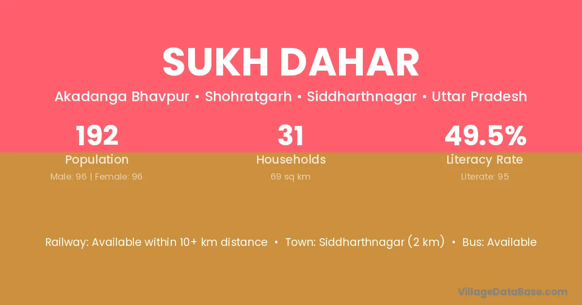 Siddharthnagar (2 km) is the nearest town to Sukh Dahar village for major economic activities and is located approximately 2 km away.