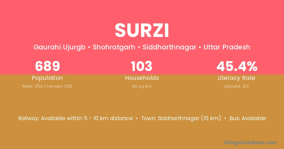 Siddharthnagar (15 km) is the nearest town to Surzi village for major economic activities and is located approximately 15 km away.