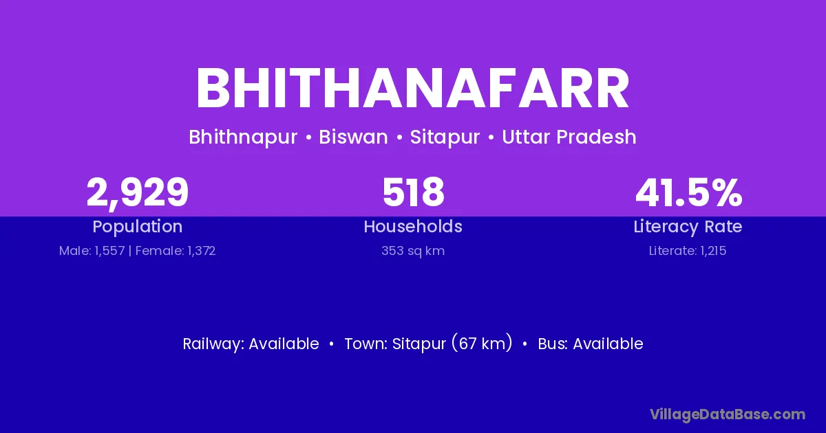 Sitapur (67 km) is the nearest town to Bhithanafarr village for major economic activities and is located approximately 67 km away.