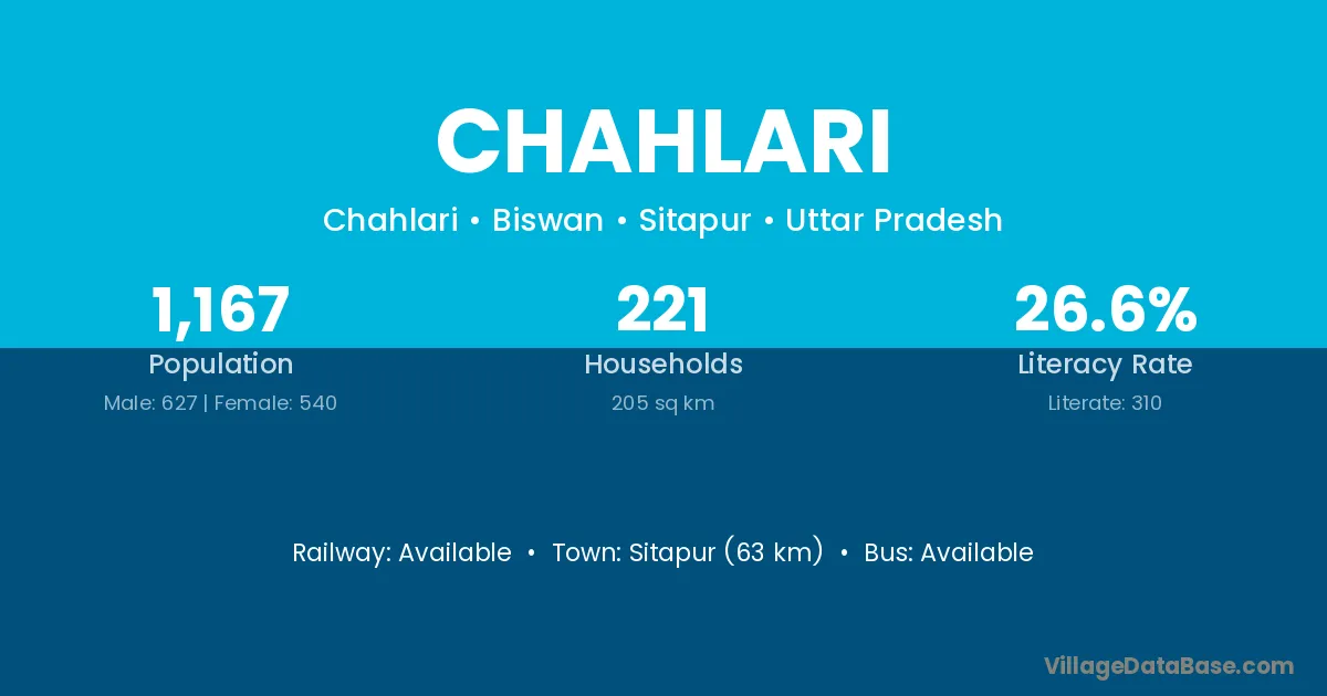 Sitapur (63 km) is the nearest town to Chahlari village for major economic activities and is located approximately 63 km away.