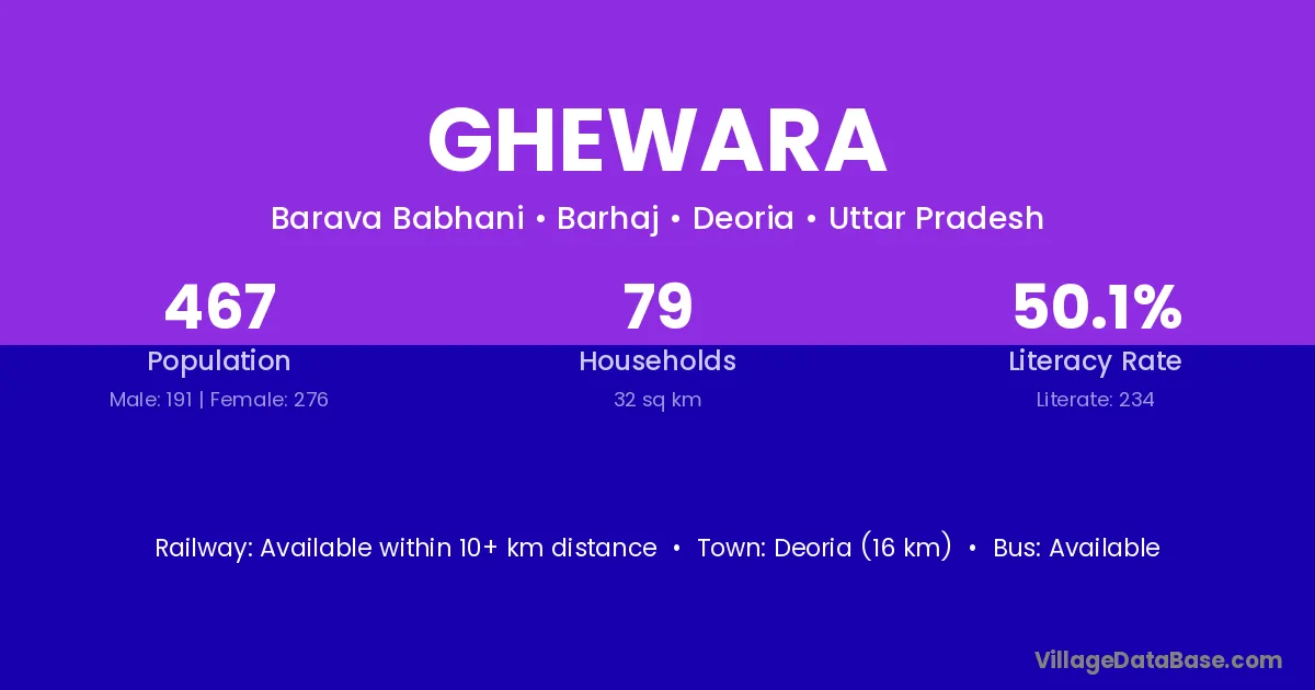 Sitapur (30 km) is the nearest town to Ghewara village for major economic activities and is located approximately 30 km away.