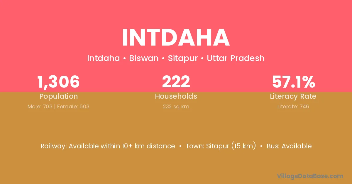 Sitapur (15 km) is the nearest town to Intdaha village for major economic activities and is located approximately 15 km away.