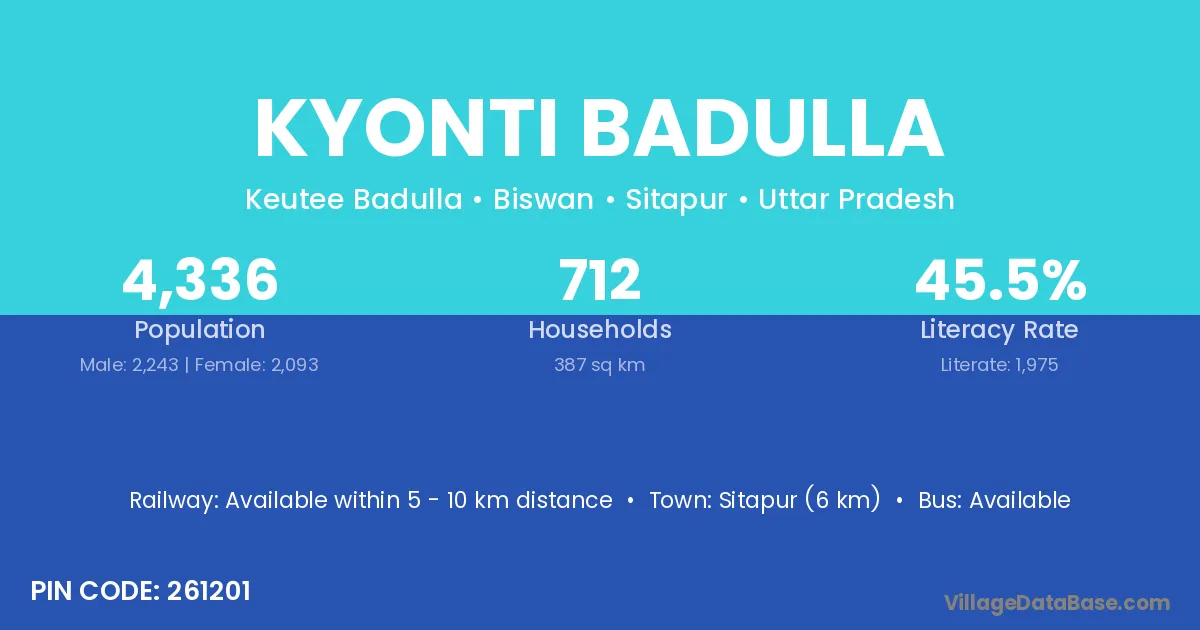 Sitapur (6 km) is the nearest town to Kyonti Badulla village for major economic activities and is located approximately 6 km away.
