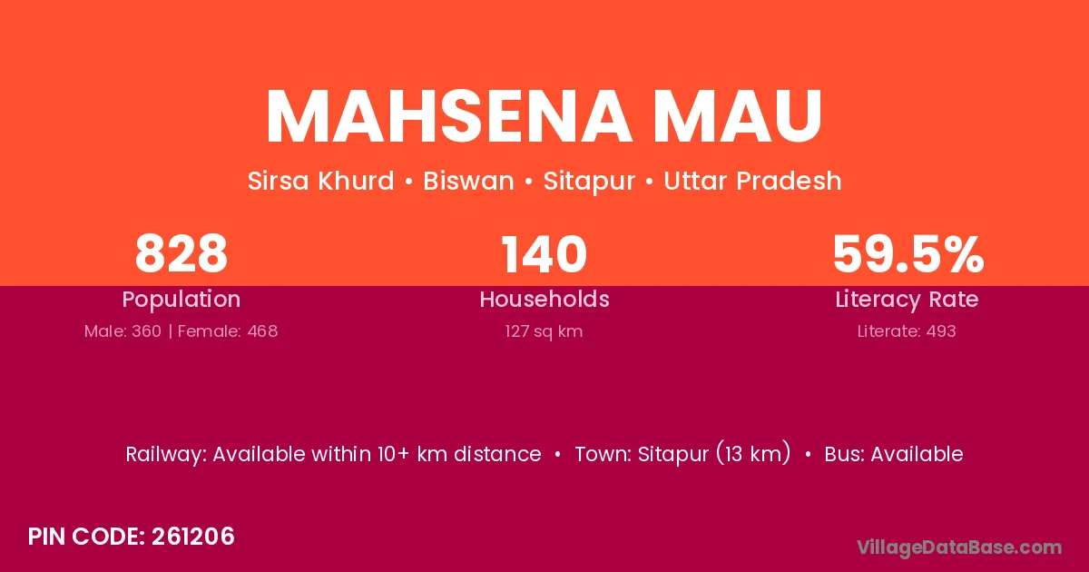 Sitapur (13 km) is the nearest town to Mahsena Mau village for major economic activities and is located approximately 13 km away.