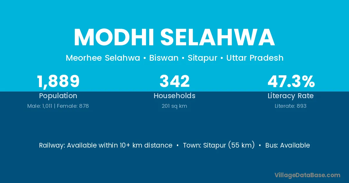 Sitapur (55 km) is the nearest town to Modhi Selahwa village for major economic activities and is located approximately 55 km away.