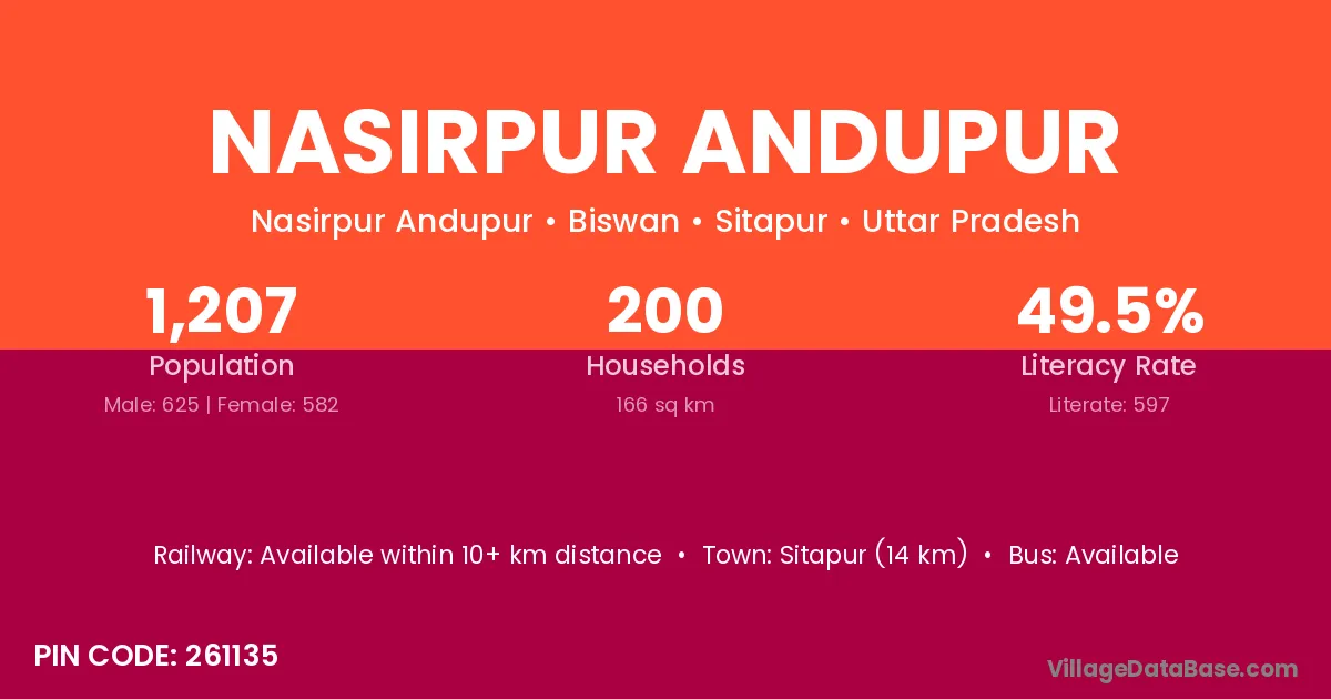 Nasirpur Andupur village has a total population of 1,207 people, of which 625 are males and 582 are females.