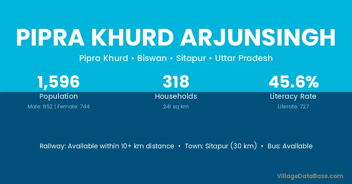Pipra Khurd Arjunsingh village has a total population of 1,596 people, of which 852 are males and 744 are females.