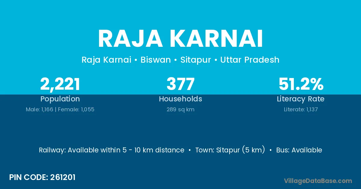 Sitapur (5 km) is the nearest town to Raja Karnai village for major economic activities and is located approximately 5 km away.
