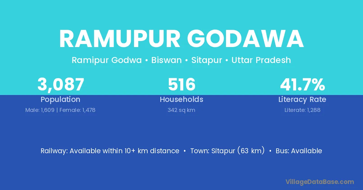Sitapur (63 km) is the nearest town to Ramupur Godawa village for major economic activities and is located approximately 63 km away.
