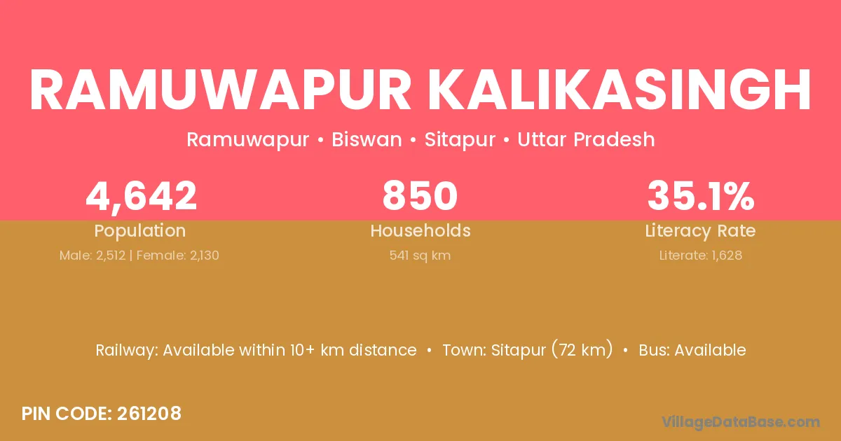 Sitapur (72 km) is the nearest town to Ramuwapur Kalikasingh village for major economic activities and is located approximately 72 km away.