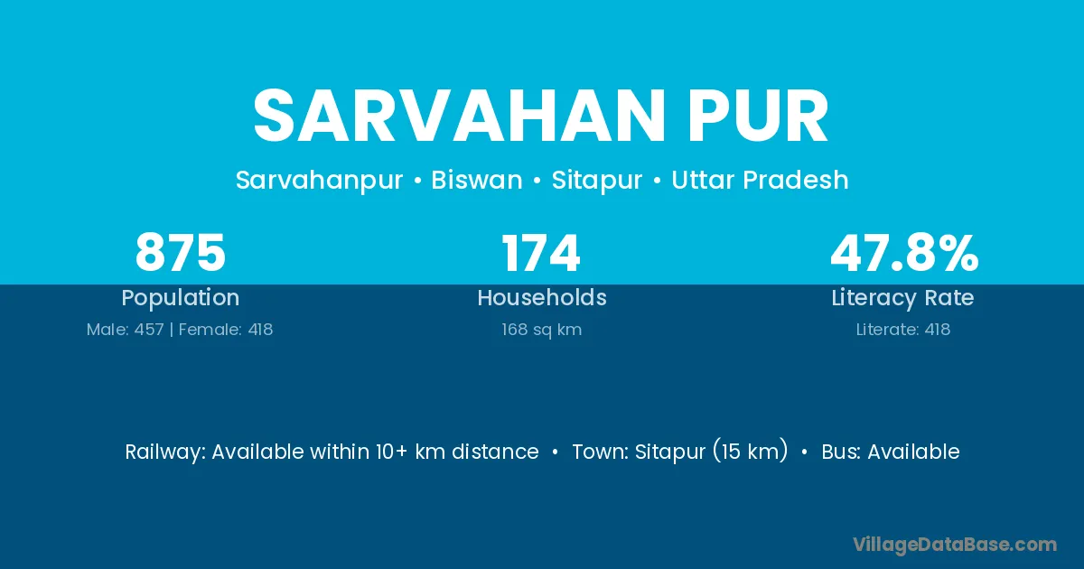 Sitapur (15 km) is the nearest town to Sarvahan Pur village for major economic activities and is located approximately 15 km away.