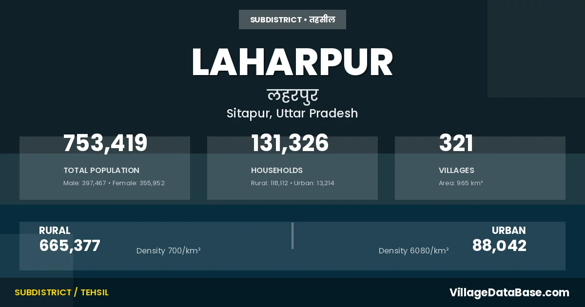 According to the 2011 census The total area of Laharpur Tehsil is 965 km², with a population of 753419 people. The population density is 781 inhabitants per square kilometre, and there are approximately 131326 houses in the sub district.