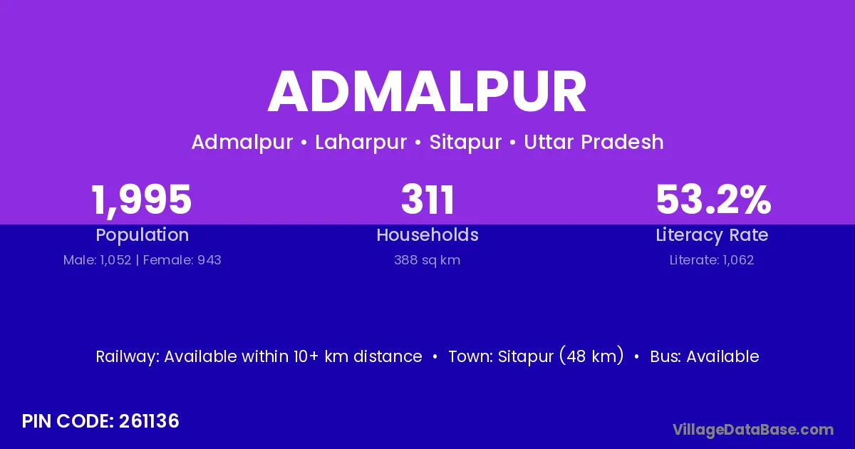 Sitapur (48 km) is the nearest town to Admalpur village for major economic activities and is located approximately 48 km away.
