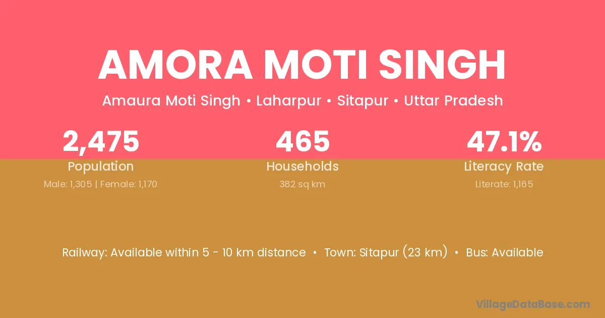 Sitapur (23 km) is the nearest town to Amora Moti Singh village for major economic activities and is located approximately 23 km away.