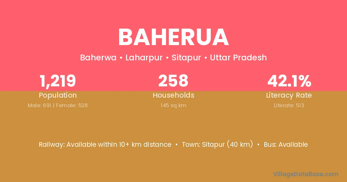 Sitapur (40 km) is the nearest town to Baherua village for major economic activities and is located approximately 40 km away.