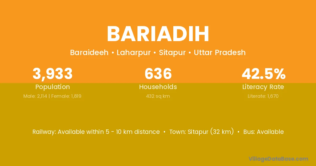 Sitapur (32 km) is the nearest town to Bariadih village for major economic activities and is located approximately 32 km away.